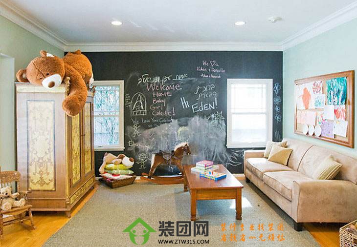 客厅,就像上面的黑板墙装修效果图一样,屋主人可以随意diy在上面可以写一些名言警句,搭配照片等等,提醒自己每天都应该努力变得更好。